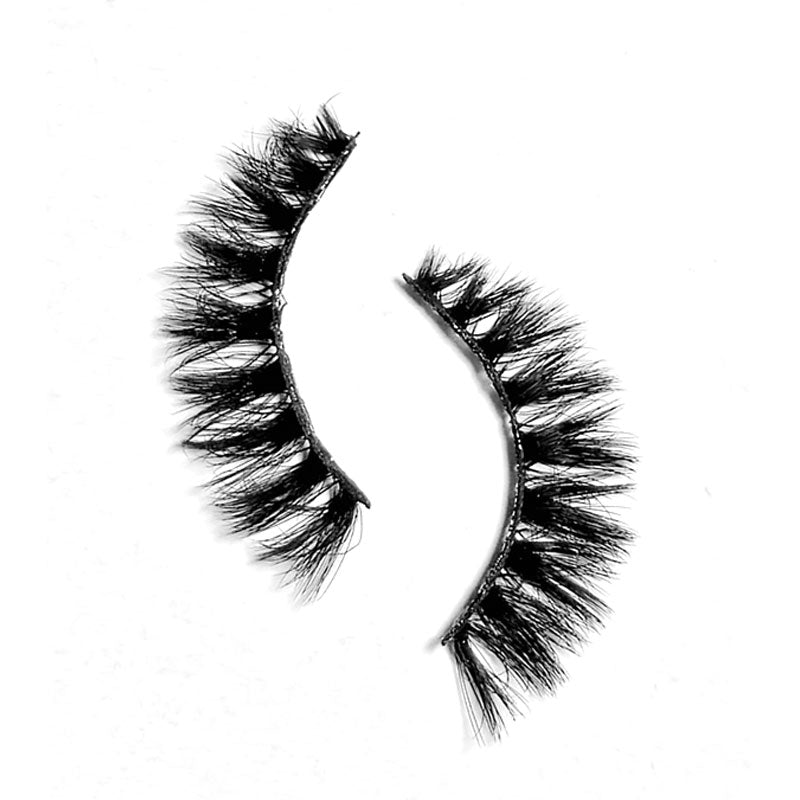 Crisscross faux mink eyelashes with winged shape design and crisscross layering creating elegant soft glam eye makeup look.